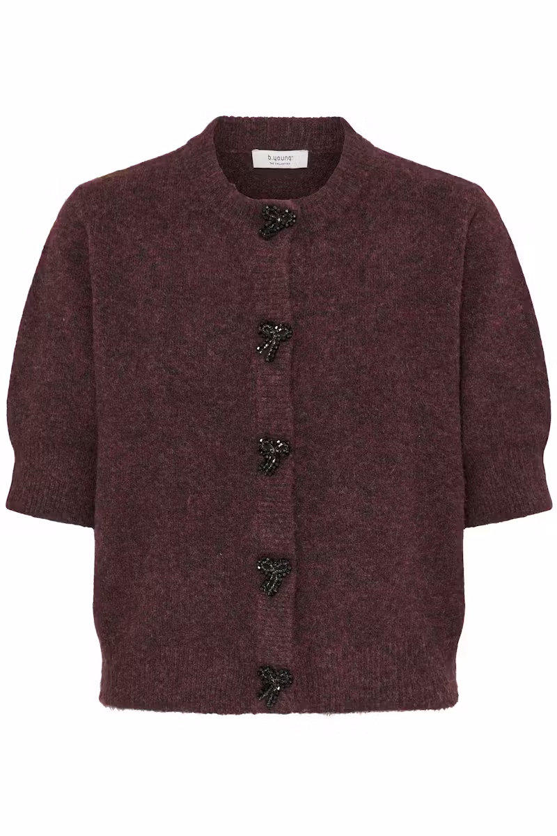 Casaco de malha com corte descontraído e decote redondo. Apresenta mangas curtas e laços decorativos como fechos de botão. A malha macia oferece conforto durante todo o dia e um estilo versátil para qualquer ocasião.