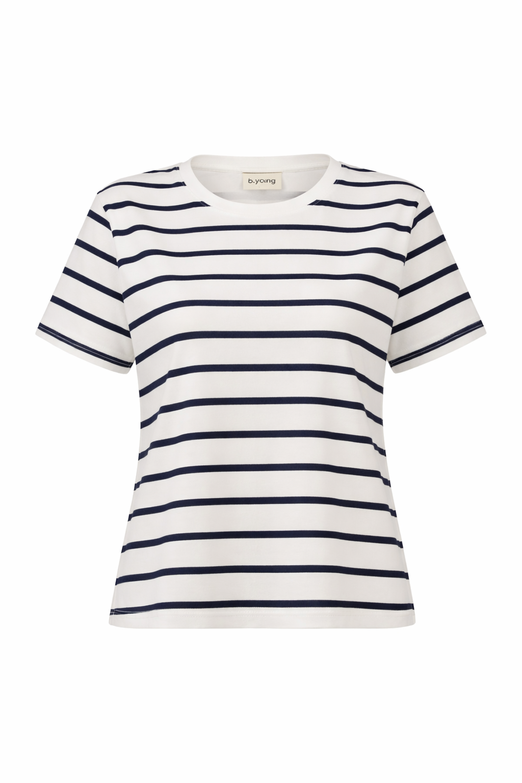 T-shirt feminina de manga curta com padrão às riscas horizontais em azul marinho sobre fundo branco. Apresenta decote redondo clássico e corte direito, proporcionando um ajuste confortável e versátil para o dia a dia.