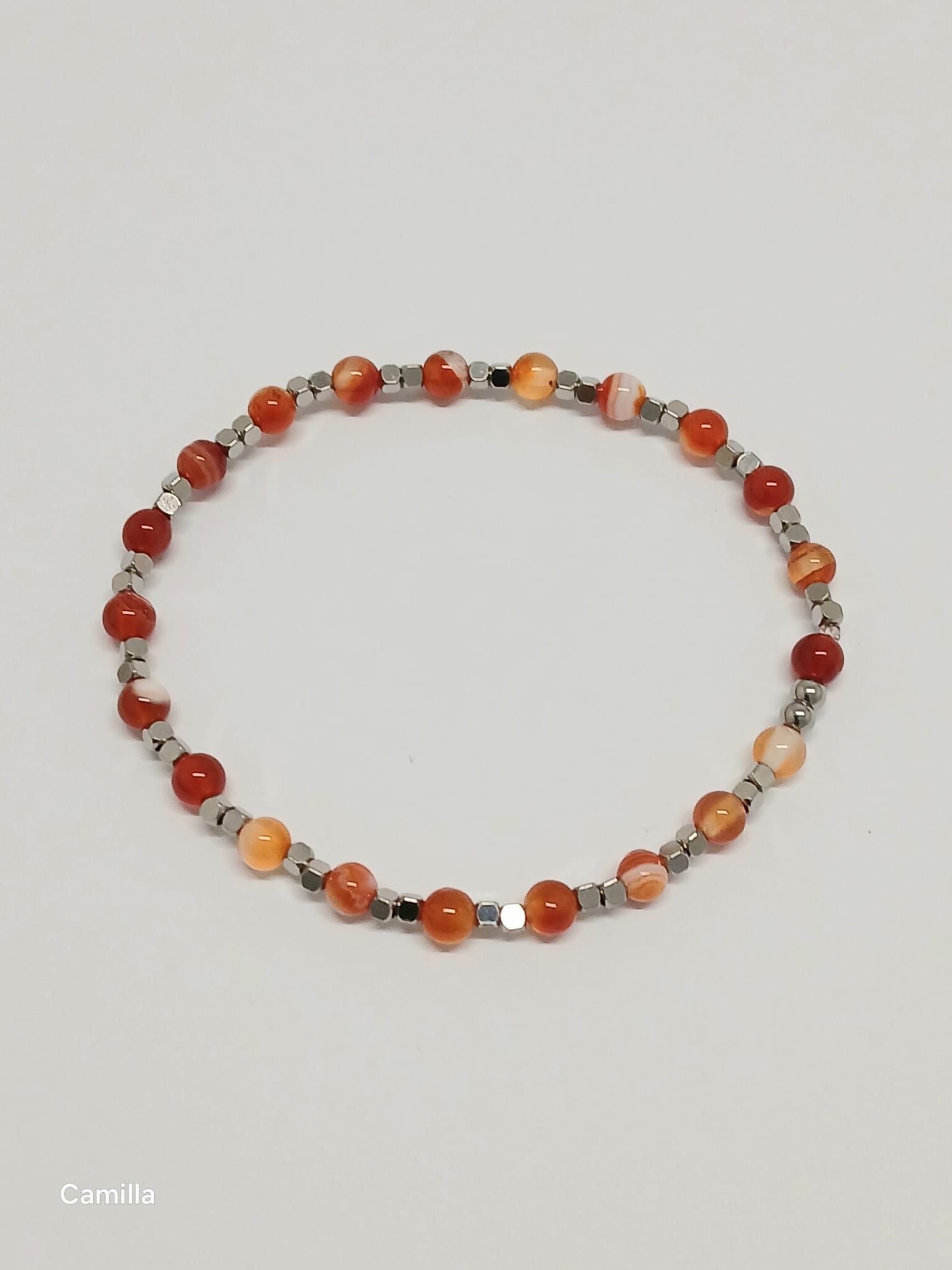 Adicione cor e energia positiva ao seu dia com a pulseira artesanal Camilla. Uma combinação poderosa de pedras naturais que une a vivacidade do fogo com a estabilidade da terra.