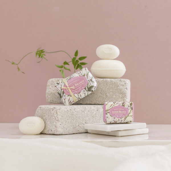 Texturado com veios que evocam as formas orgânicas das rochas esculpidas pelo tempo, o sabonete Hajjar Blanc de 180g é um tributo à beleza crua da Natureza.