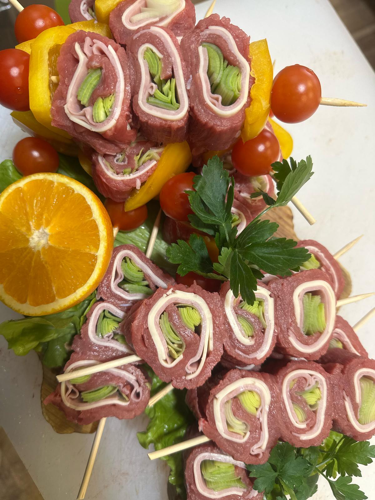 Mercado da Praça Espetadas de vitela, bacon, queijo e alho francês